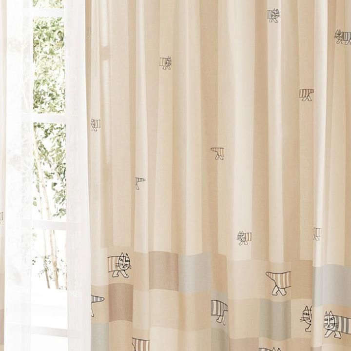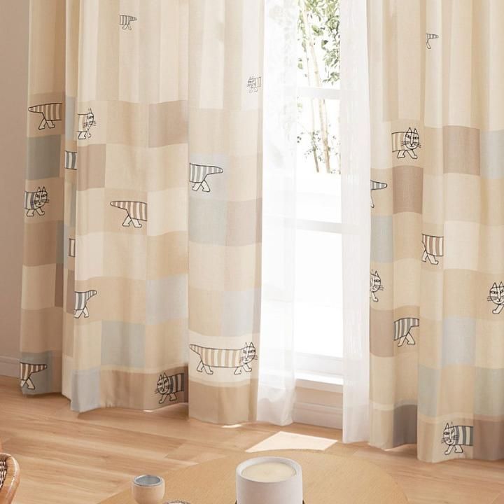 北欧を代表する陶芸家リサ・ラーソンが生んだ、しましま猫の「マイキー」が、 パズルの世界に迷い込んだようなユーモラスでモダンなデザイン「K1028 マイキーパズル」。 整然と並ぶパネル型の絵羽柄は、ドレープカーテンではめずらしい大胆な構成で、リサらしい遊び心と洗練が絶妙に共存しています。 北欧雑貨や陶器が好きな女性の心に響く、ポップでアートな一枚。 お揃いのキュートなタッセル付きで、まるでインテリアに小さなギャラリーを飾るような感覚を楽しめます
