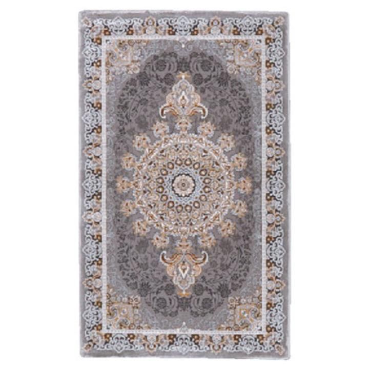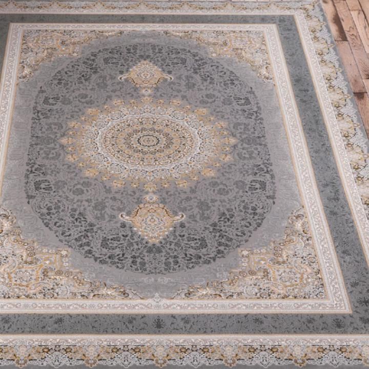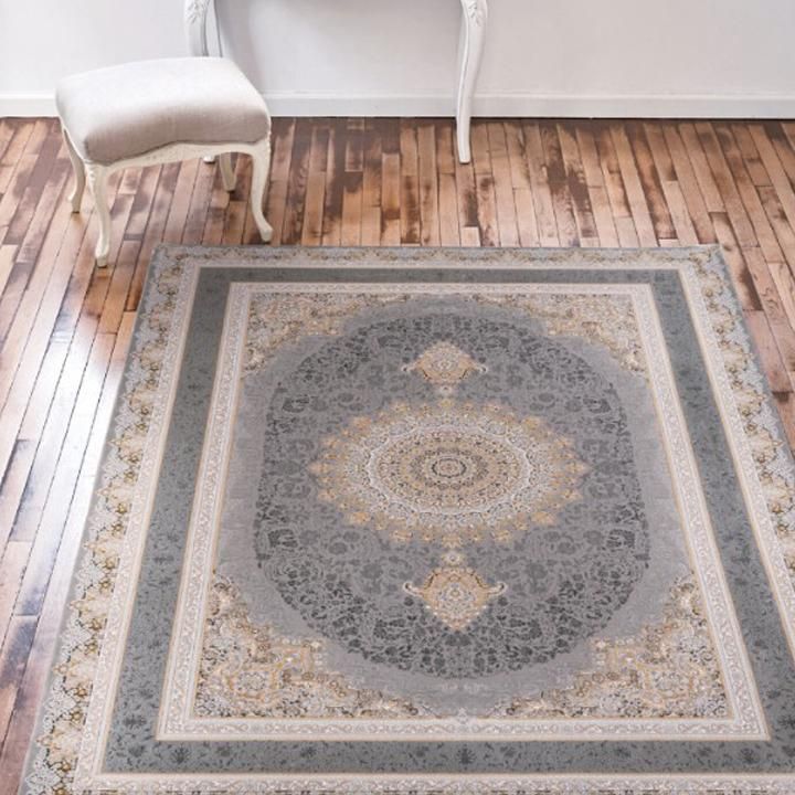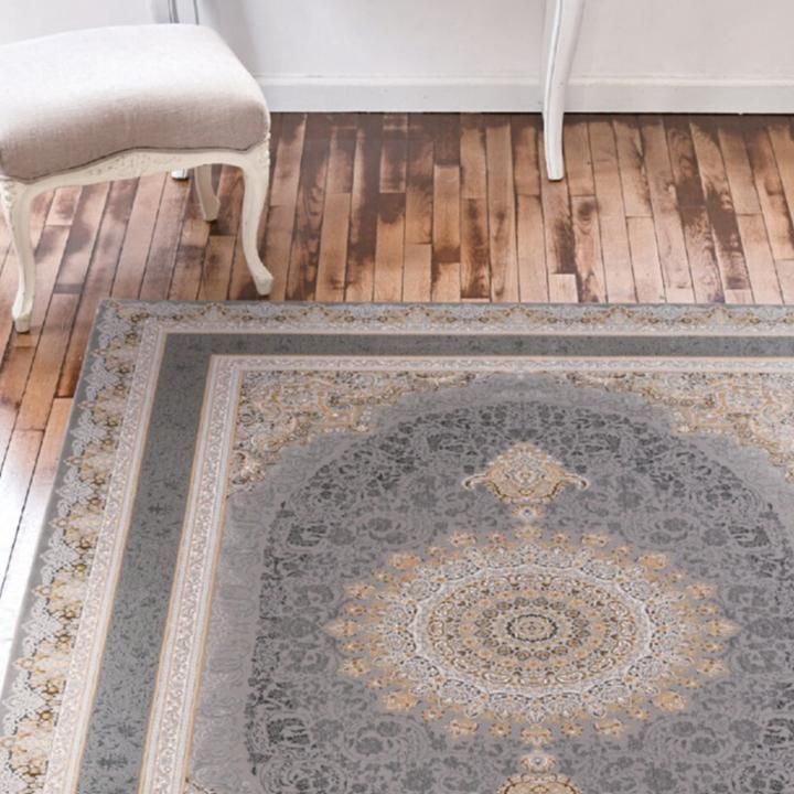 【グレー(GY)】:プレーベル ラグ カプソ グレーは重厚感のあるグレーを基調に、シルバーとゴールドの繊細な装飾をあしらった高貴な印象。ホワイトオークやグレージュの床と合わせると上品でモダンな空間に。大理石調テーブルやガラス家具との相性も良く、ホテルライクでラグジュアリーなリビングを演出します。