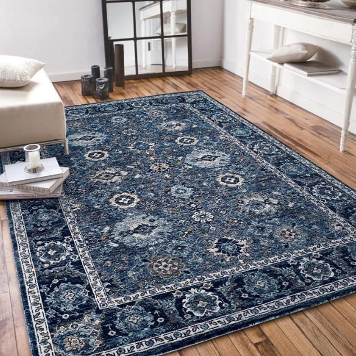 【NV ネイビー】:Prevell ラグ ディーン ネイビーはやわらかなグレーベースにビンテージ調の模様を重ねたデザインは、北欧ナチュラルやホテルライクな空間にもぴったり。ホワイトオークやアッシュ系の床材との相性が良く、柔らかく上品な印象で、季節を問わず取り入れやすい万能カラーです。