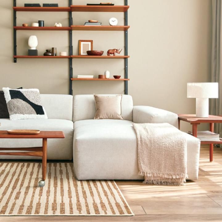 北欧テキスタイルのような温かみと、軽やかなモダン感。遊び毛が出にくいフラットウィルトン織で、季節を問わず快適に使える上質ラグ。