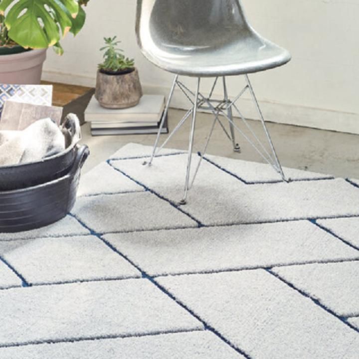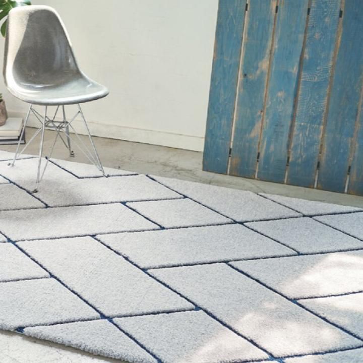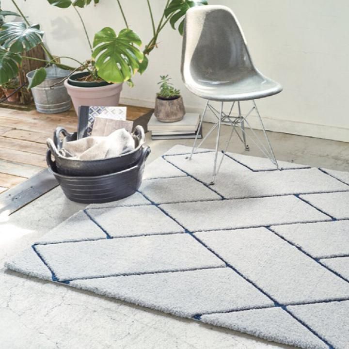 プレーベル ラグ ルノン ブルーはやわらかなライトブルーにネイビーのラインが映える爽やかな印象。コンクリートやホワイトインテリアと好相性で、北欧モダンや西海岸スタイルにもマッチします。観葉植物やナチュラルウッドの家具を合わせれば、清潔感と温かみを両立したカジュアルリビングに。